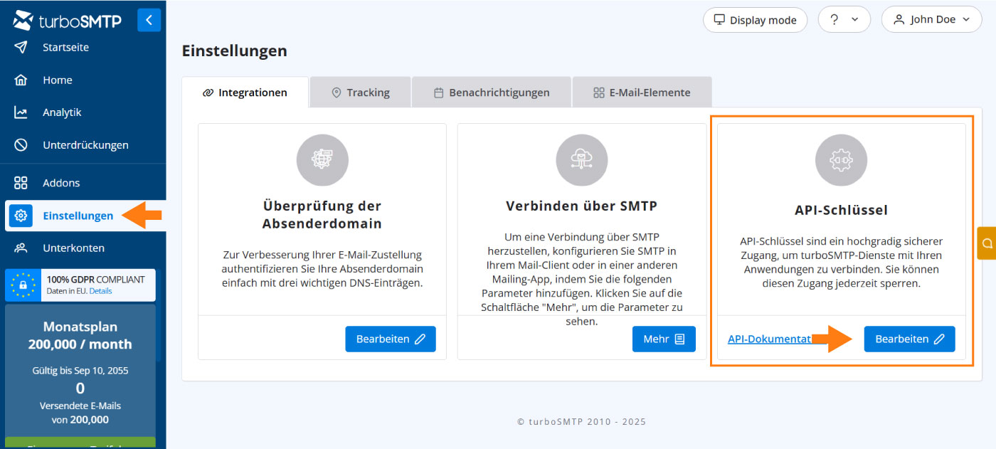 - Melden Sie sich im turboSMTP-Dashboard an und wählen Sie im Hauptmenü links die Option Einstellungen.