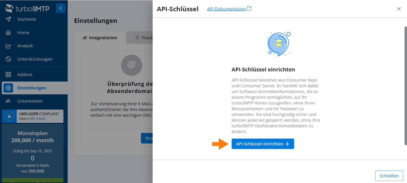 API-Schlüssel schützen Ihre Anwendungen, wenn sie sich mit turboSMTP verbinden, und sind notwendig, um E-Mails sicher über die SMTP-Server zu senden.