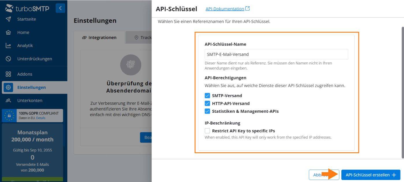- Geben Sie den Namen Ihres API-Schlüssels in das entsprechende Feld ein (dieser Name dient nur als interne Referenz im turboSMTP-Dashboard). Wählen Sie dann aus, welche Dienste die API nutzen darf (SMTP-Versand, HTTP-API-Versand, Statistiken und Management-APIs). Optional können Sie den Zugriff auf bestimmte IP-Adressen beschränken.