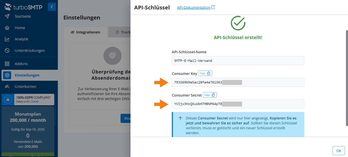 - Consumer Secret, ein privater Code, der nachweist, dass Ihre Anwendung berechtigt ist, turboSMTP zu verwenden. Er fungiert als Passwort.