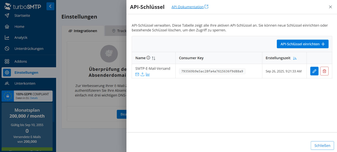- Volle Kontrolle: Sie können API-Schlüssel jederzeit widerrufen oder neu generieren und bestimmen, welche Anwendungen auf Ihre turboSMTP-Dienste zugreifen dürfen.