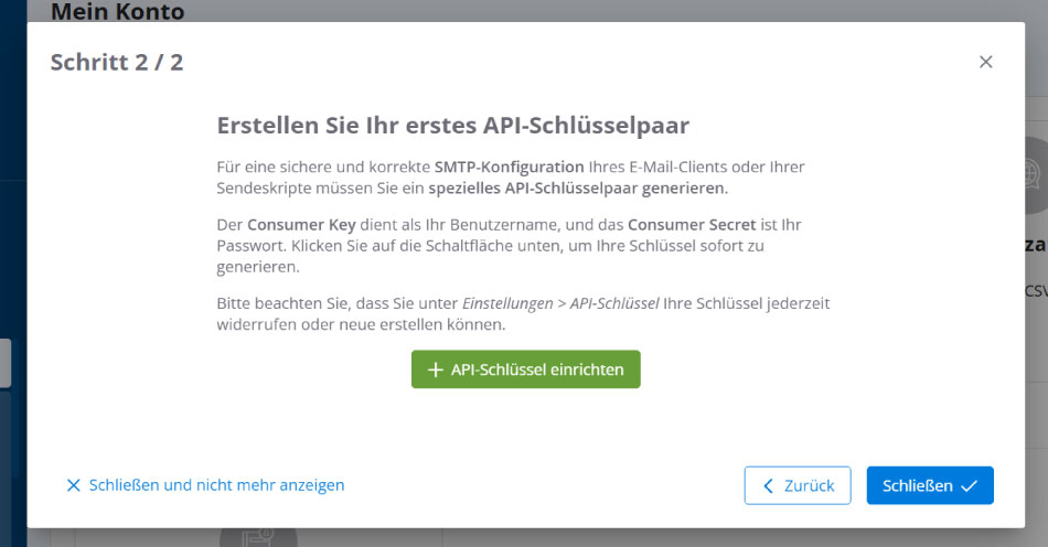 Beim ersten Login als neuer turboSMTP-Kunde wird ein Popup angezeigt, das Sie auffordert, Ihre ersten API-Schlüssel zu erstellen. Dieser Schritt ist erforderlich, um E-Mails sicher über SMTP zu versenden.